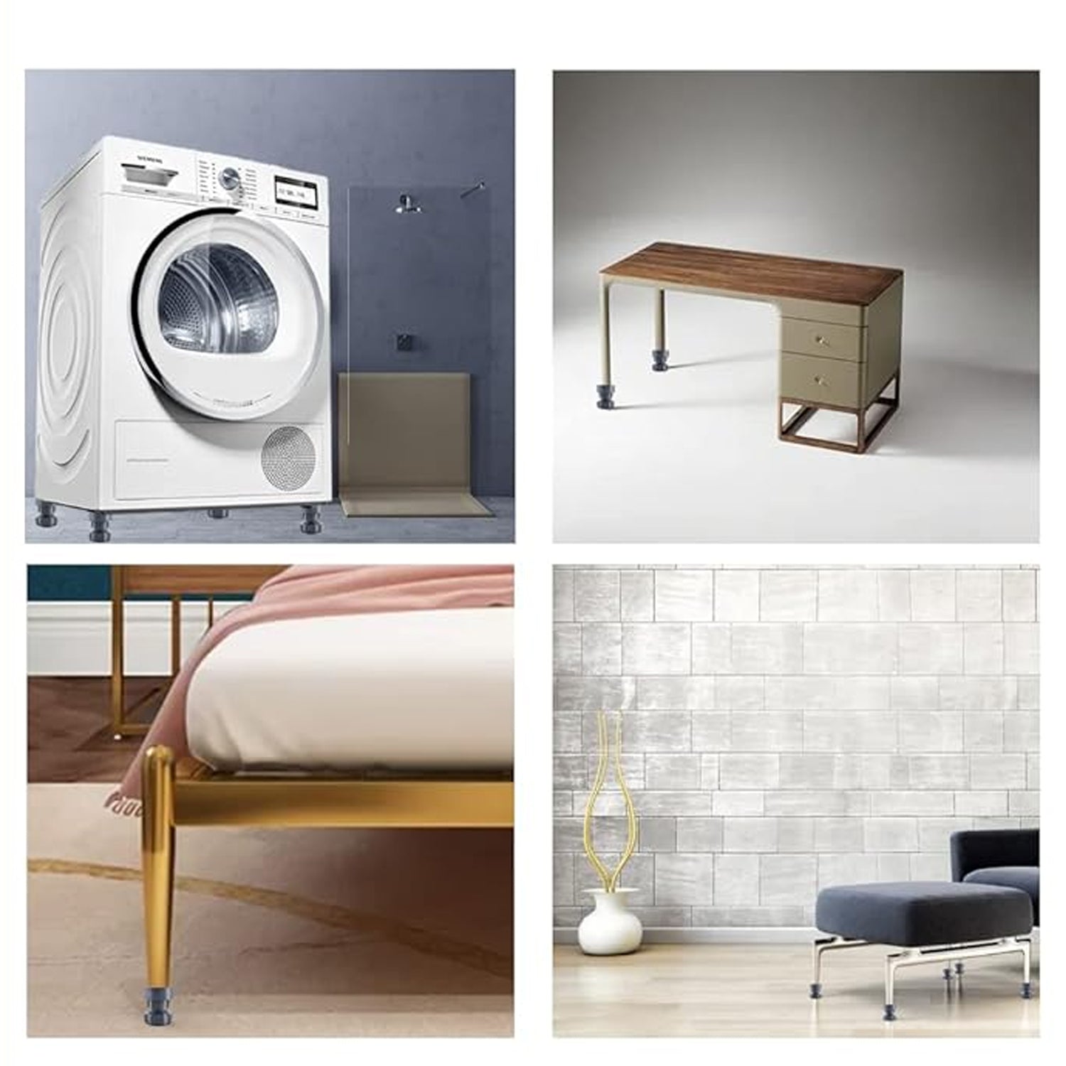 Easy to install: Just install washing machine anti vibration pad under the feet of a washing machine or dryer, no tool or messy adhesive is required. After installation, your furniture and home appliances raised by a few centimeters for convenient cleaning and preventing moisture.