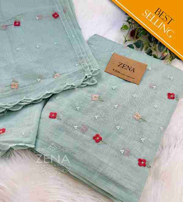 This image features a Best Selling traditional Indian suit set from the brand crafted from a soft, lightweight, muted pink cotton fabric. The material is richly adorned with delicate, all-over floral embroidery, showcasing tiny scattered motifs in appealing shades of red and peach, interspersed with white dots. This classic, feminine design and breathable fabric make it a perfect choice for elegant daytime or casual festive wear.
