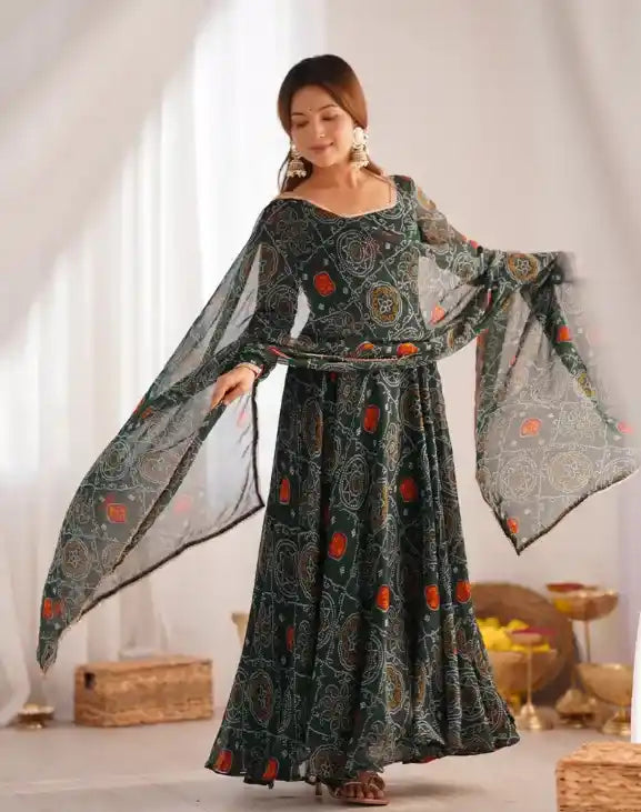 Ideal for women who love classic Indian elegance with a contemporary twist, this Rani Pink Bandhej Gown is a must-have for your festive wardrobe.