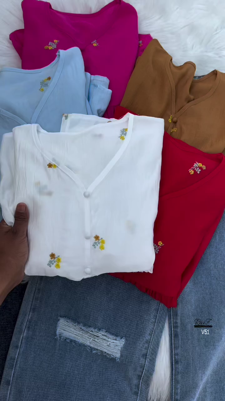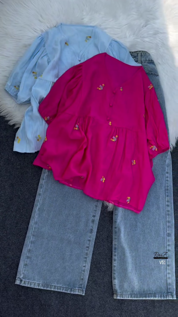 Top Design:Casualpeplum-styletop with elegantfloral embroideryfor a chic yet relaxed look.
