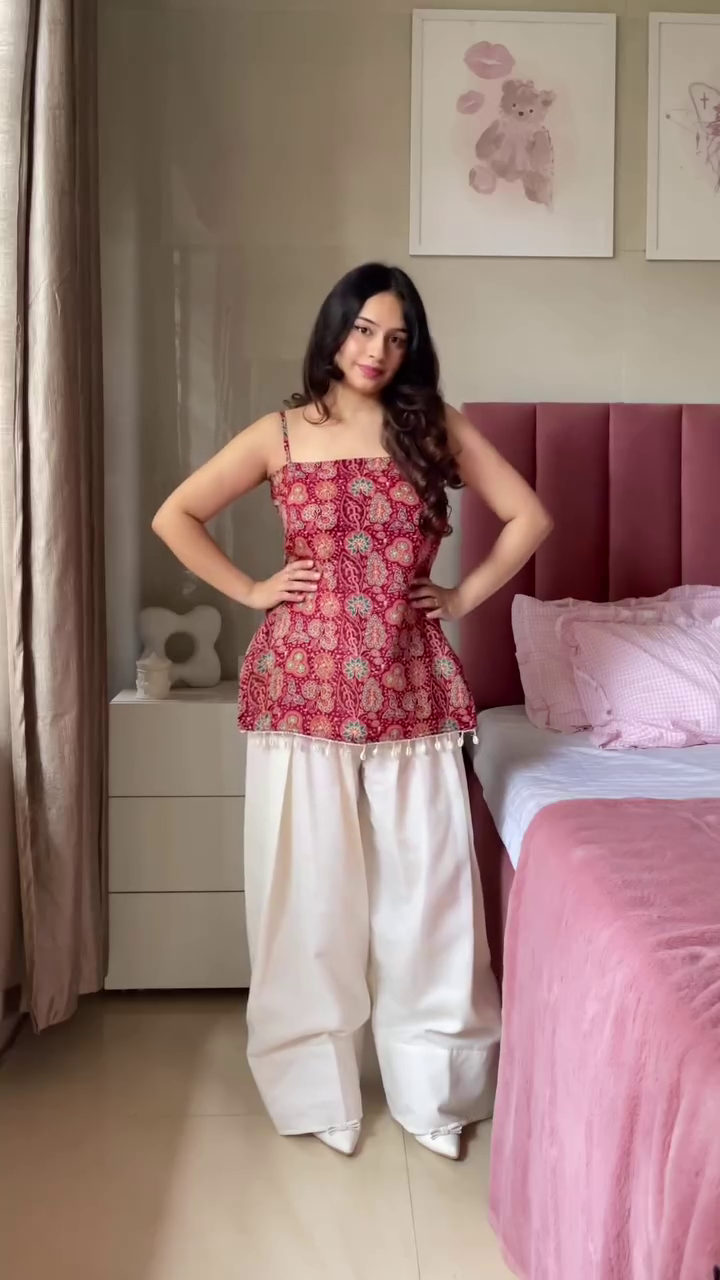 Bottom:White palazzo pantsoffering a breezy, comfortable fit.