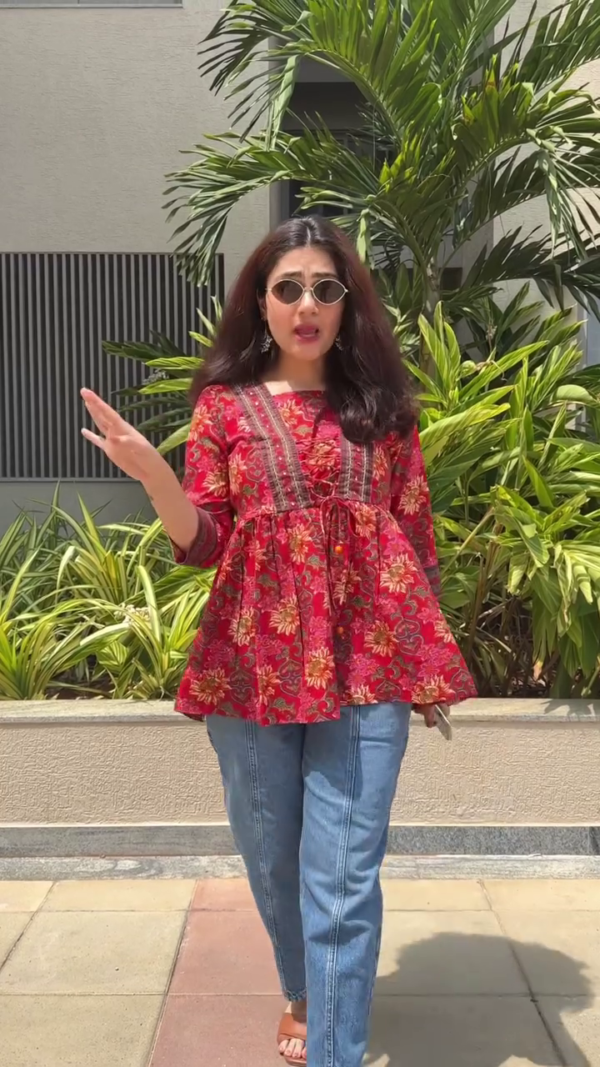 Women’s Floral Printed Peplum Top with Three-Quarter Sleeves, Front Tie Detailing, and Round Neck in Red and Blue Variants Paired with Stylish Blue Denim Jeans – Casual Ethnic Fusion Wear